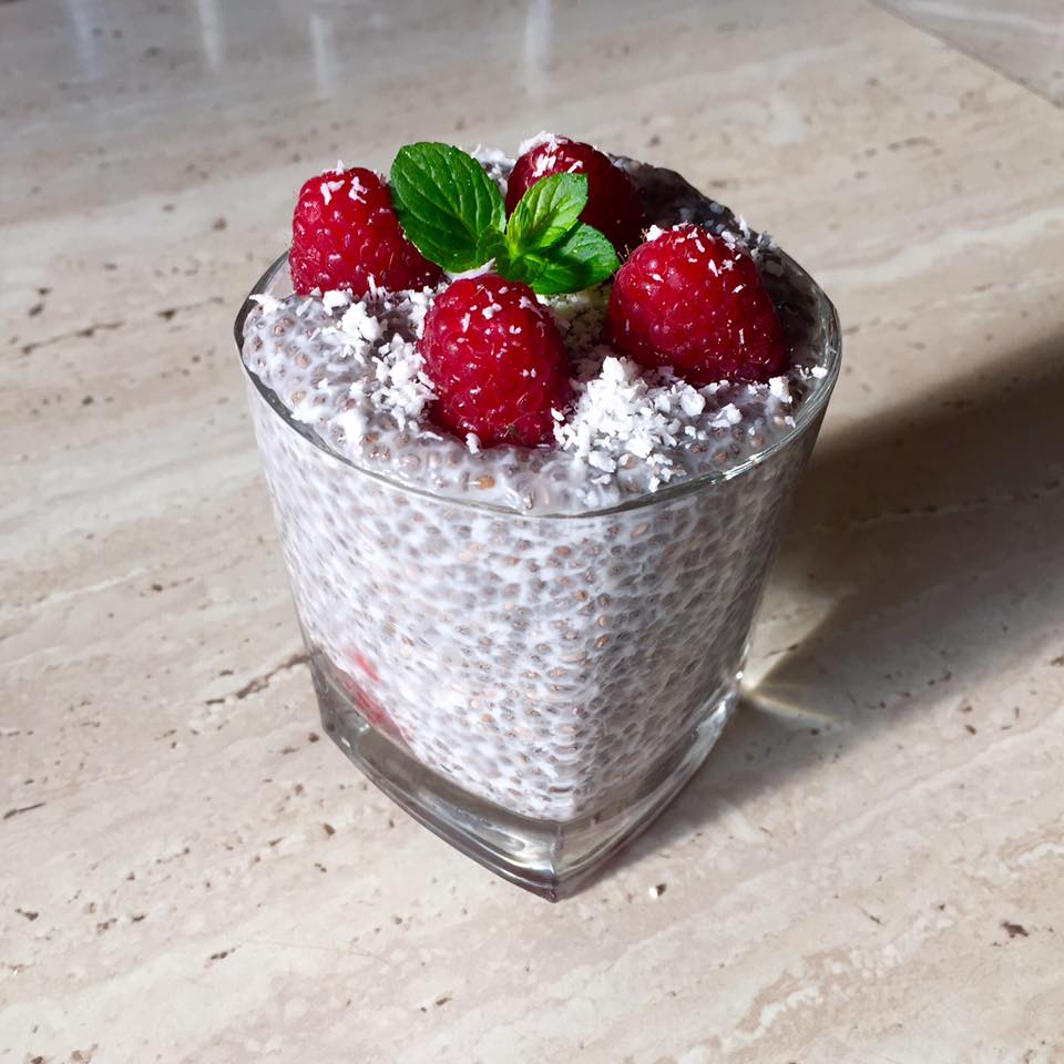 recept je veľmi jednoduchý 😊 V miske si zmiešame 1 hrnček kokosového mlieka, 3 PL chia semienok a 2 PL kokosu, osladíme si to s 1 ČL medu a pekne rozmiešame. Takto pripravenú zmes si necháme počas noci odležať v chladničke. Ráno tam na nás bude čakať kokosový chia puding, ktorý si ozdobíme malinami 😊